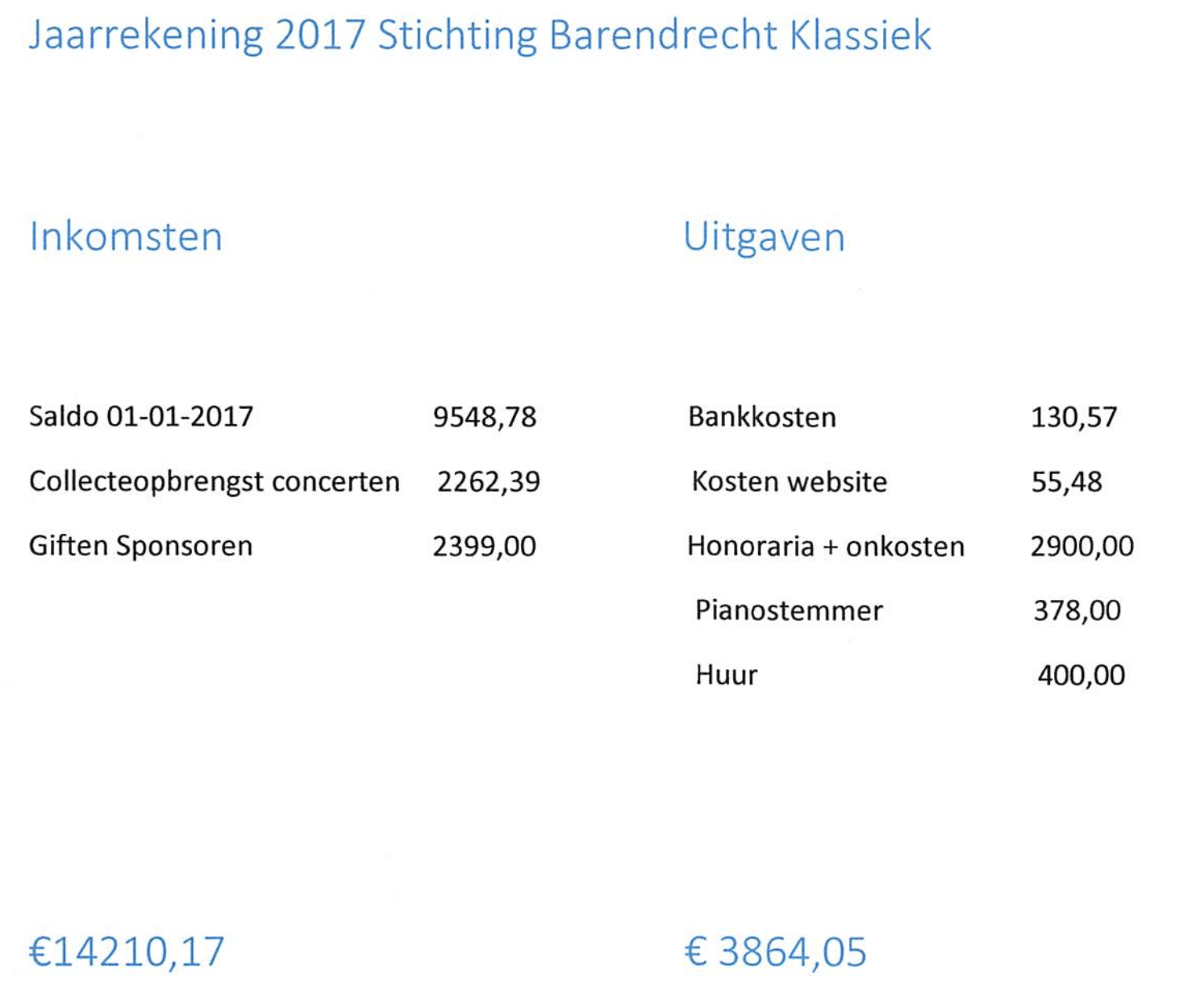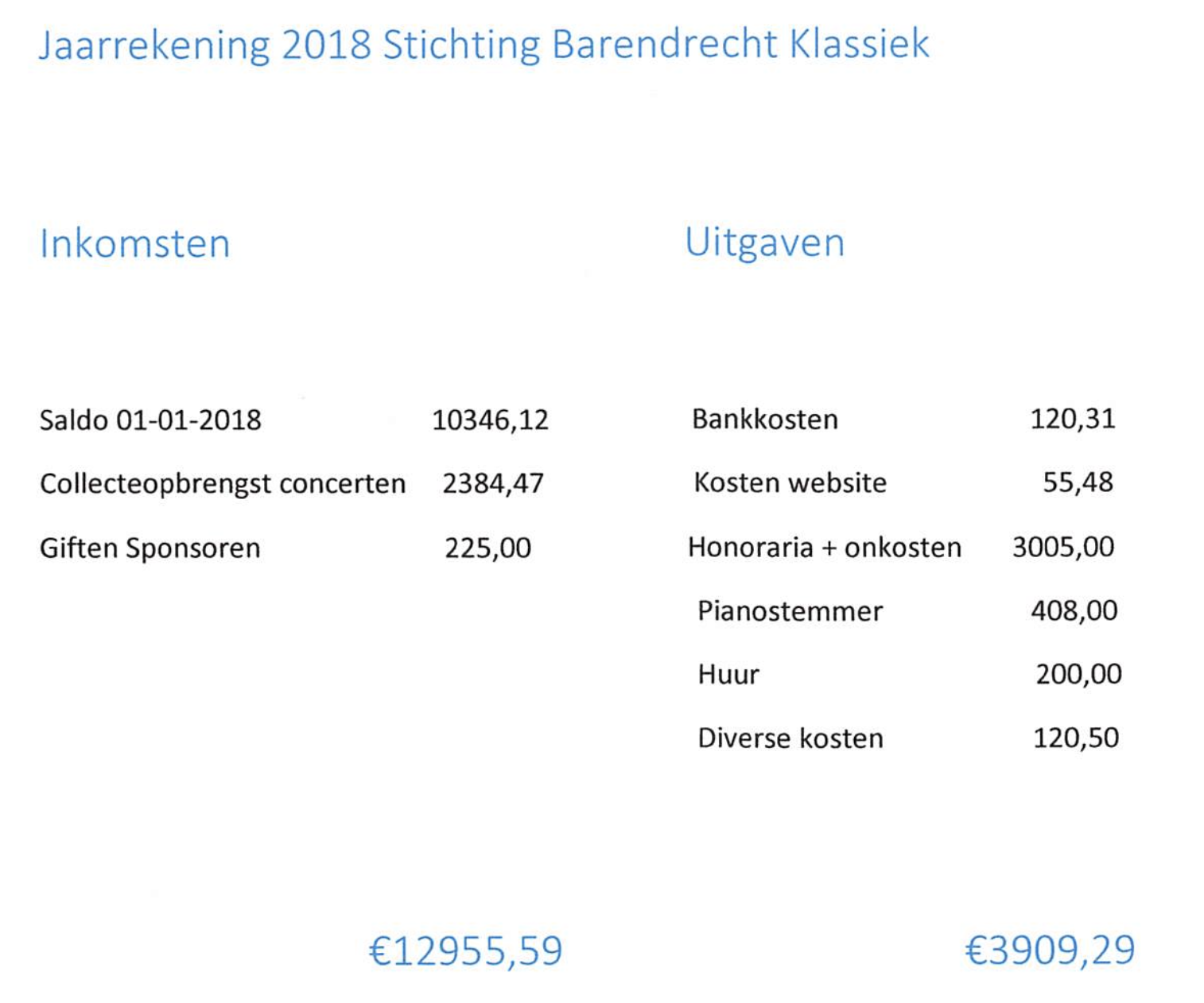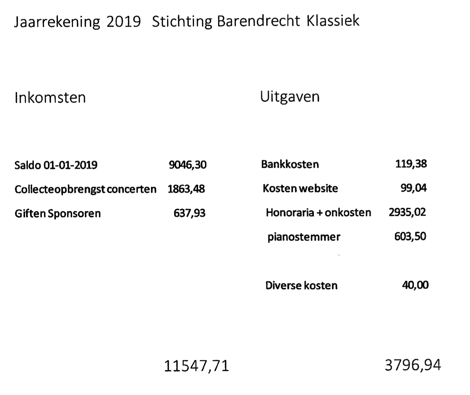 Ons ‘vermogen’ is ondergebracht op een bankrekening bij de RABO-bank. Het wordt besteed aan honoraria van musici, pianostemmer en verdere lopende kosten.